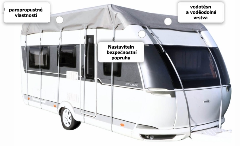 Vnější vrstva potahu v šedé barvě je vodotěsná a paropropustná, a tak účinně chrání před všemi povětrnostními vlivy. Uvnitř krytu se nachází bílá vrstva z jemného polypropylenu, která přilne přímo ke karoserii vozidla a chrání lak před poškrábáním. Vestavěný filtr chrání krycí materiál před škodlivými účinky slunečního záření a zajišťuje tak dlouhodobé používání bez zmačkání. Vrchní vrstva potahu, vodotěsná a voděodolná, účinně zabraňuje vniknutí vody. Boky krytu jsou vyrobeny z materiálu s vodotěsnými a paropropustnými vlastnostmi, které jsou navrženy tak, aby odváděly přebytečnou vlhkost zpod plachty. Nastavitelné bezpečnostní popruhy stabilizují poloviční kryt na přívěsu a chrání ho před větrem.