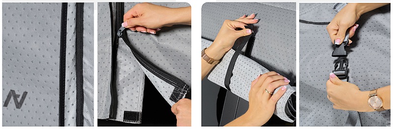 - Snadná instalace: Zipy usnadňují nasazení a sundání potahu